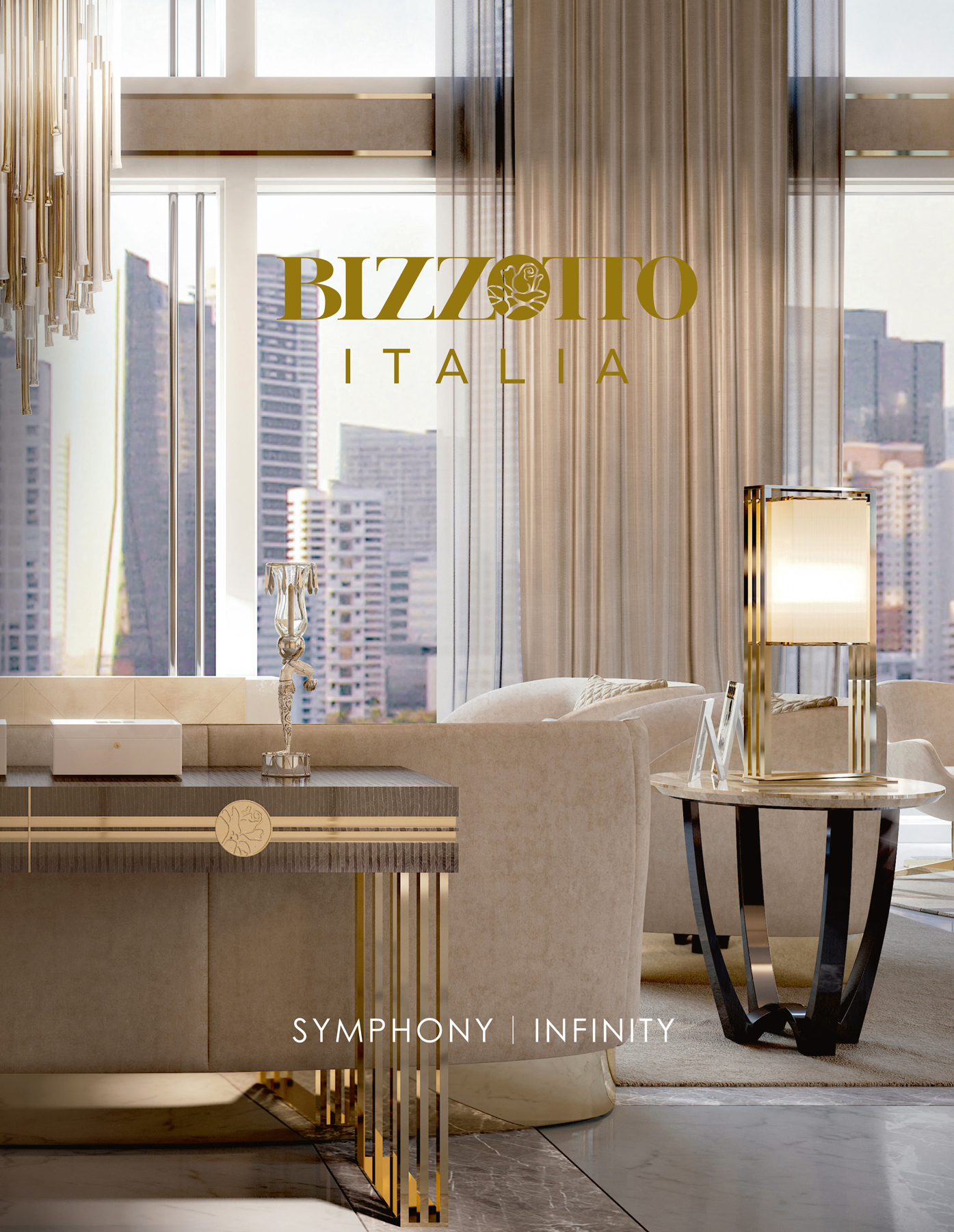A triumph of elegance and discreet luxury, Infinity is the collection that stands out due to the pure forms of its furnishings, designed starting from regular lines and simple geometries. Thai-wood essences recall the refinement of a pinstriped fabric, in a harmonious contrast with the delicate nuances of mother-of-pearl tones. The desirable furnishings are accentuated by the reflections of the steel and gold frames, in perfect synchrony with the inserts of the beautiful Bizzotto Italia “Rose”, an elegant and timeless stylistic detail.