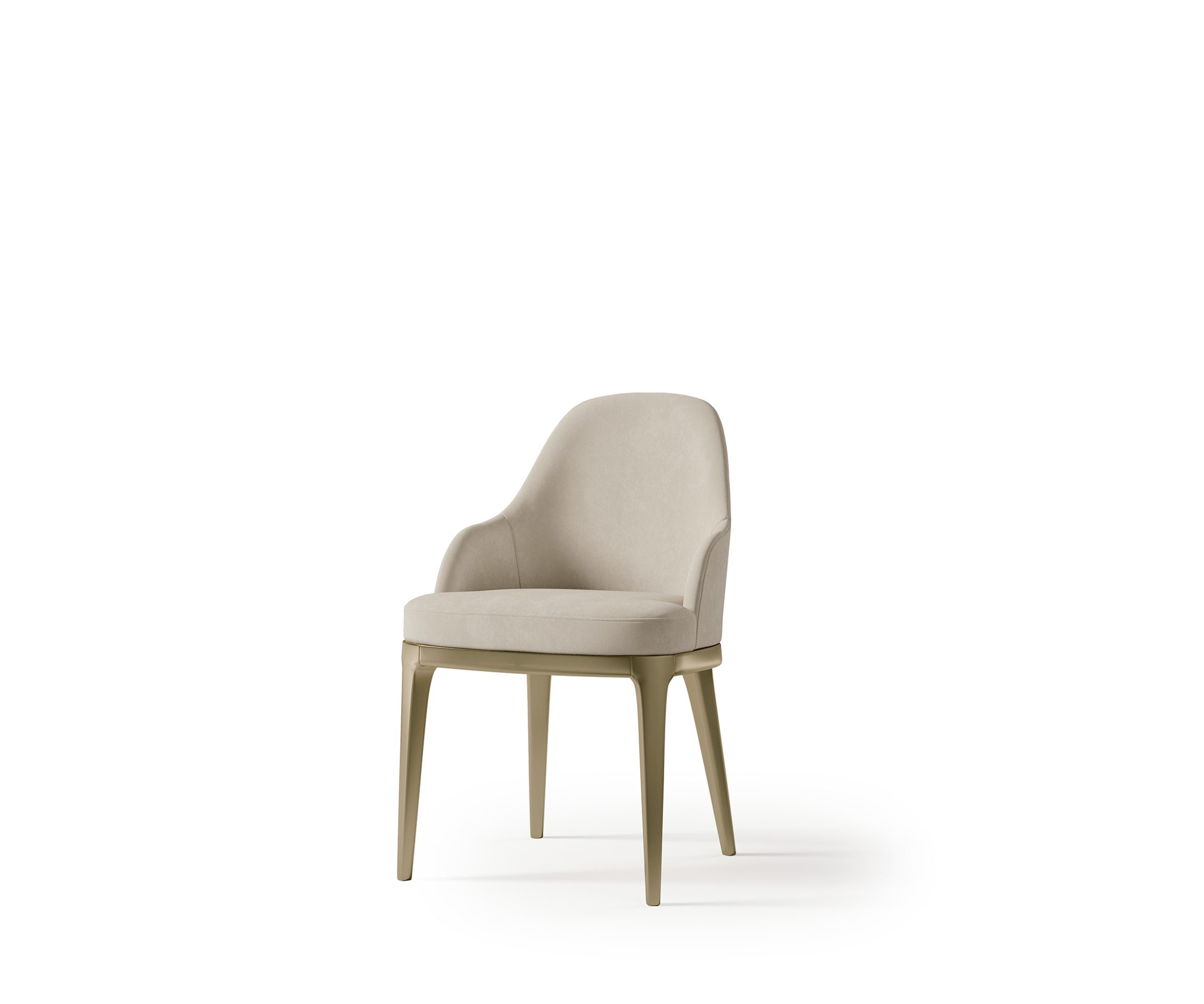 背面と前面に異なる生地を使用したバイカラー仕様も可能で、コントラストのある視覚的な遊びを演出します。また、背もたれの裏側や側面のアームレストに外側キルティング加工を施すことで、洗練された質感と視覚的なテクスチャーが加わり、椅子のエレガントな輪郭を際立たせます。