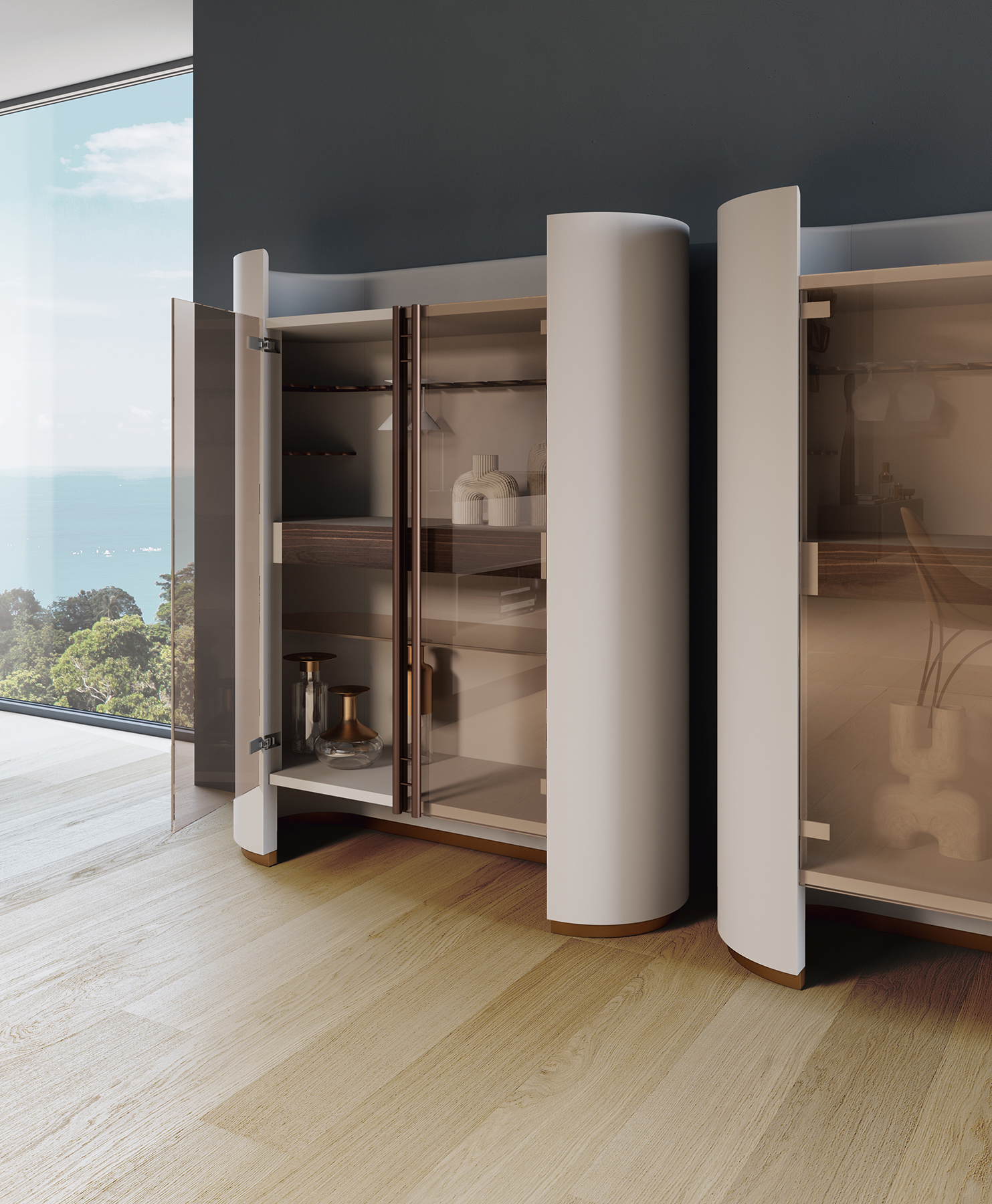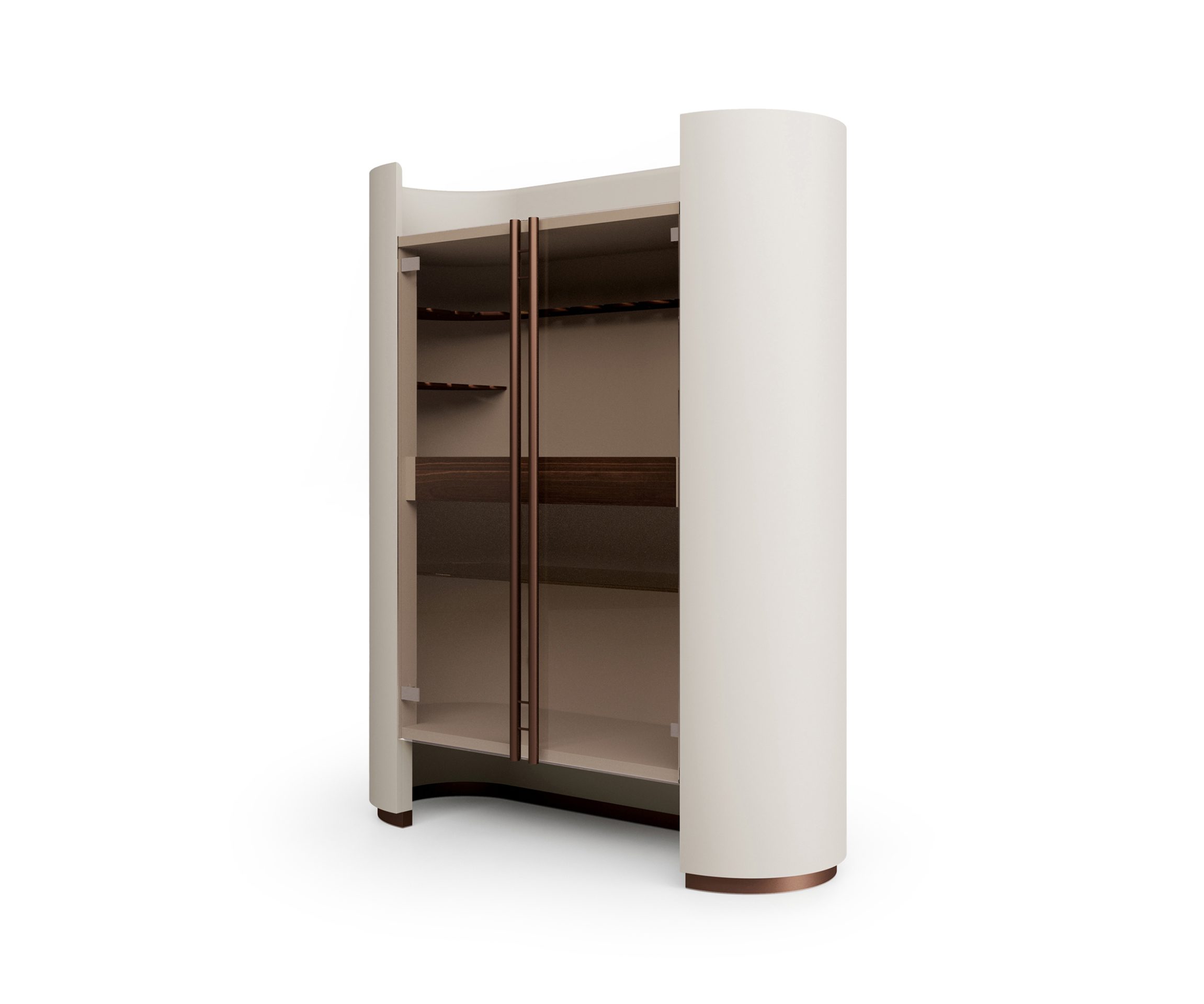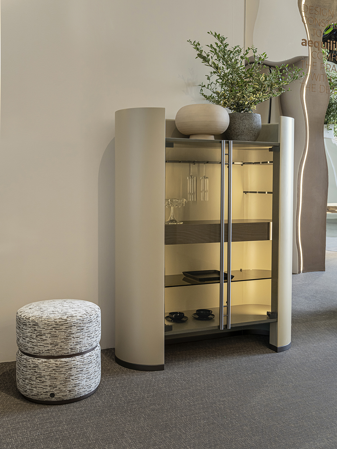 Ikatコレクション特有の丸みを帯びたフォルムにより、この高級バーキャビネットは様々な空間に柔軟に調和します。