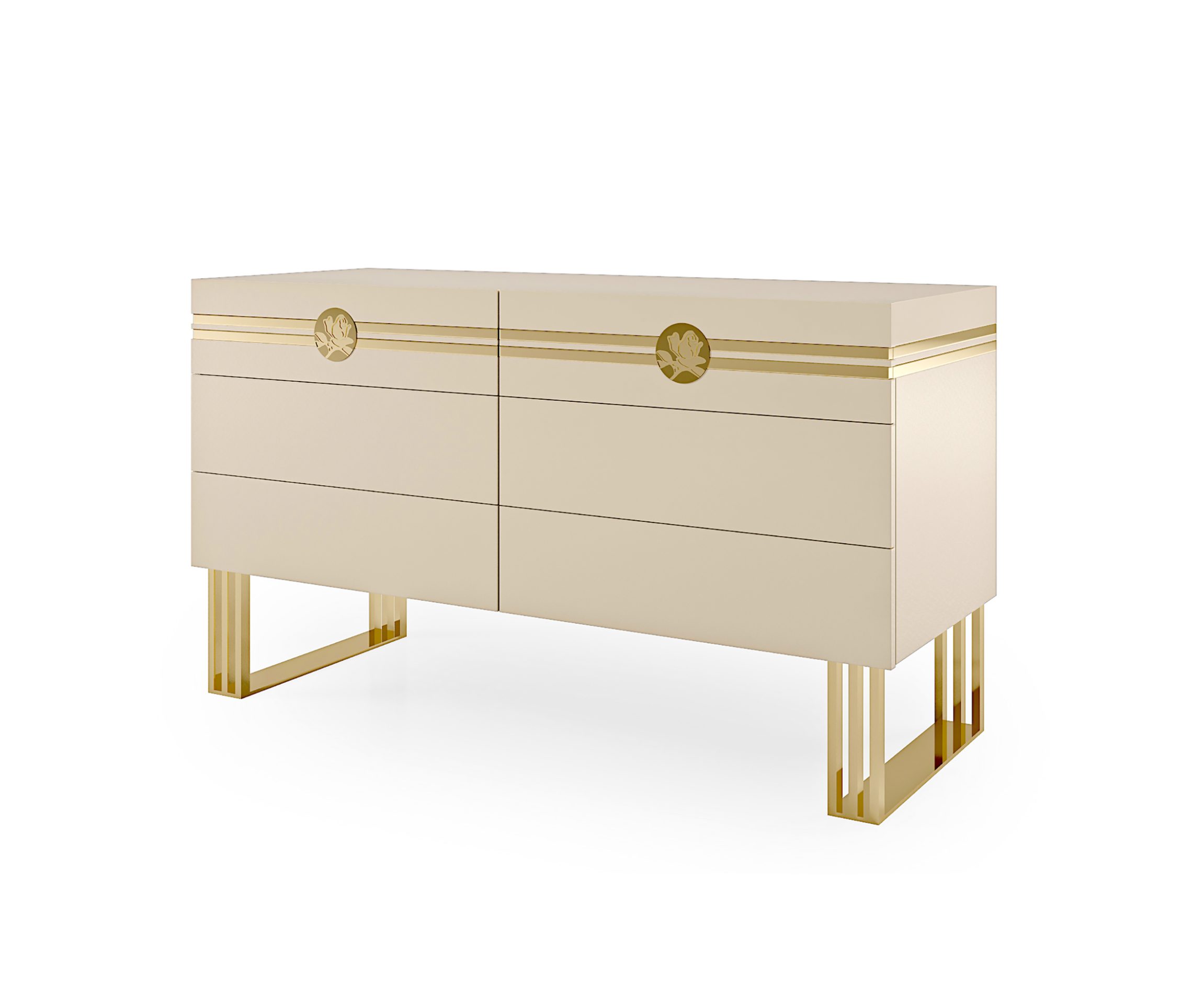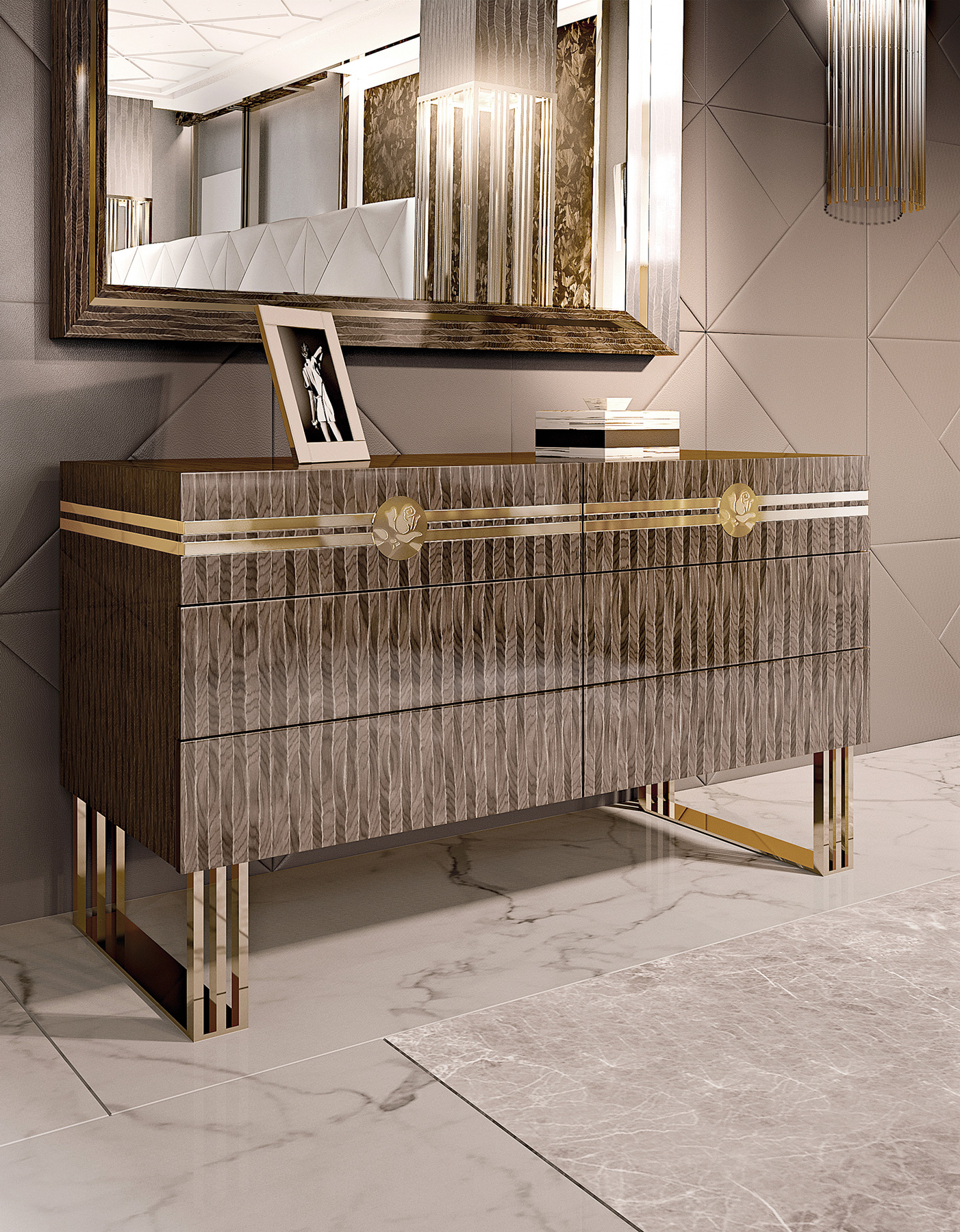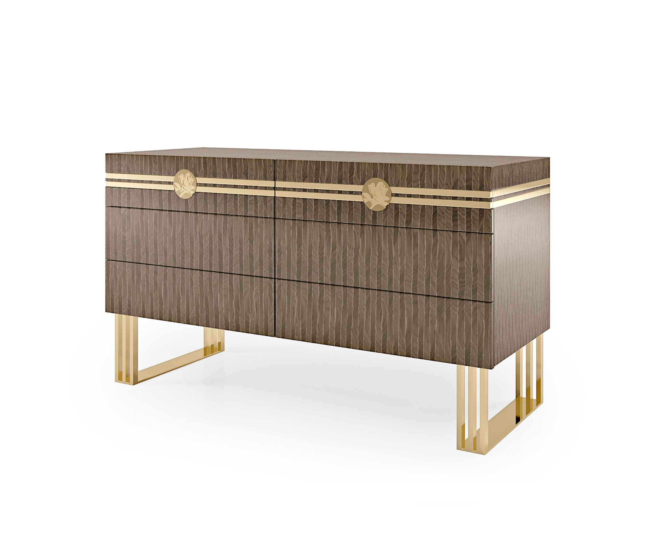 ナイトゾーンは、BizzottoItalia の Infinity コレクションのすべての価値を内包しています。エレガントな「タイウッド」仕上げまたはラッカー仕上げで提案されるこのチェストは、個性的で唯一無二のデザインを誇ります。チェストのデザインは、脚部の金属素材と鮮やかなコントラストを成し、彫刻されたバラの装飾インサートの洗練された美しさと絶妙なバランスを保っています。バラのモチーフは、引き出しの前面を走る金属箔でさらに引き立てられています。三脚型の脚部は、24金メッキ仕上げまたはクローム仕上げのバリエーションで展開。世界で最も美しい寝室を彩るのにふさわしい、ラグジュアリーなナイトゾーンのために設計された家具です。