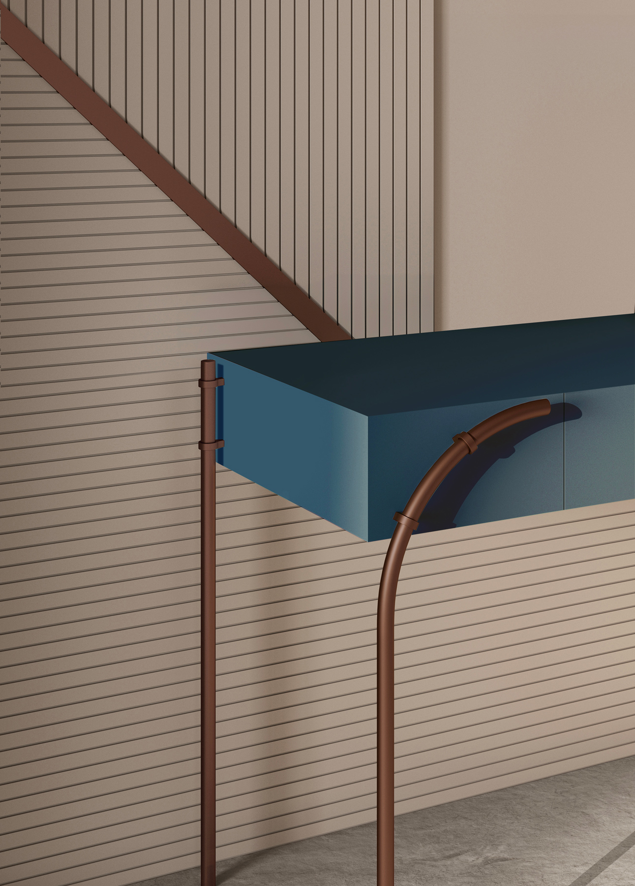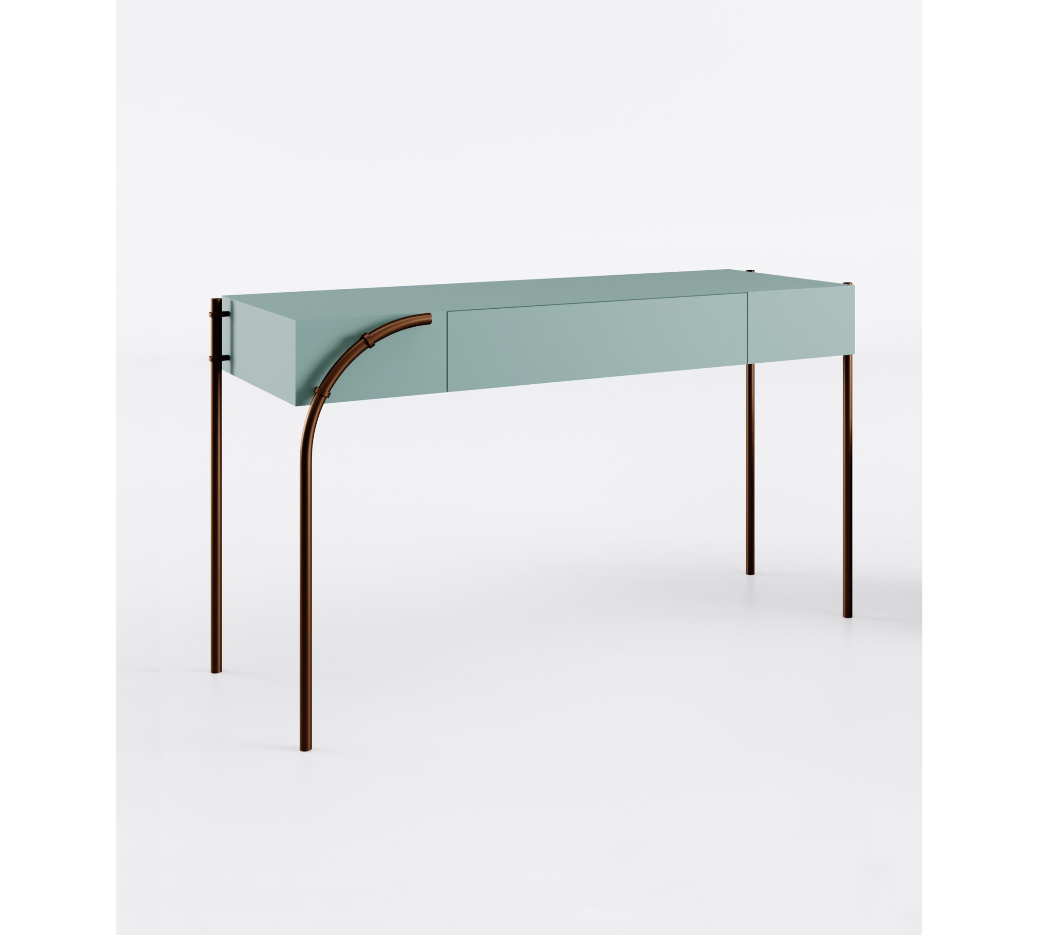 コンパクトで洗練された SCÉNE ライティングデスクは、ホームオフィスや小さなワークスペース、多機能な空間を必要とする環境に理想的なエレガントなインテリアアクセサリーです。曲線を描く丸棒の脚部と、直線的な構造のボリュームが融合し、軽やかさとフォーマルな厳格さを兼ね備えた視覚的バランスを生み出します。 ニュートラルカラー、パステルトーン、鮮やかな色合いから選べる SCÉNE は、ミニマルでありながら個性的なフォルムで空間に個性と変化をもたらす存在となります。
