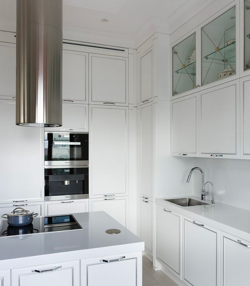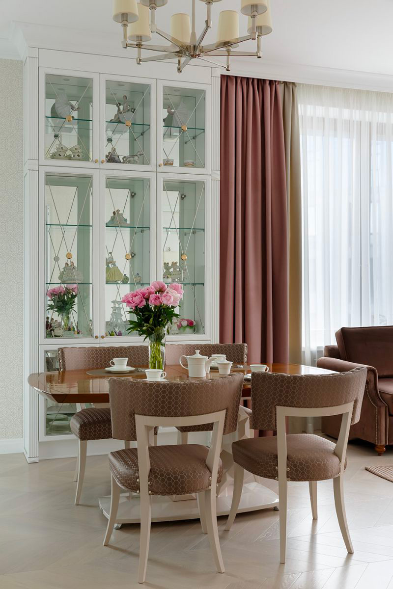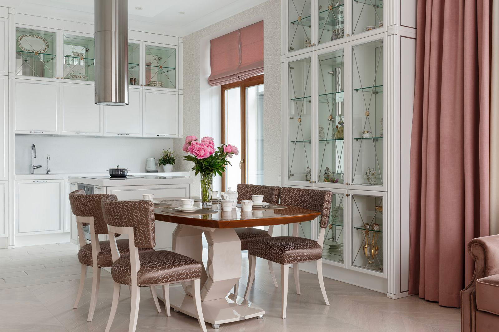 このキッチン空間は、現代的なエレガンスを基調とし、クラシックなアクセントや装飾的なディテールによって、その温かみと洗練さが一層引き立てられています。カラーパレットは明るく柔らかなパウダートーンで構成され、白とテーブル天板の温かみある木材が織りなす繊細なニュアンスが、明るくタイムレスな雰囲気を生み出します。アンティークピンクのビスコース生地に微細なジオメトリーパターンを施したチェアは、ロマンティックな色彩を添え、家具のクリーンなラインと美しく調和します。空間にバランスと個性をもたらす存在です。チェアの隣に置かれた Pandora ダイニングテーブルは、この空間の主役として際立ちます。チェリーウッドの天板は、幾何学的で彫刻的な八角形のベースによって支えられ、構成にダイナミズムと個性を与えています。家具のフォーマルなデザイン言語はニュークラシックに着想を得ており、クラフト的な要素を取り入れることで、エレガントで軽やか、そして視覚的に調和のとれた空間を実現しています。