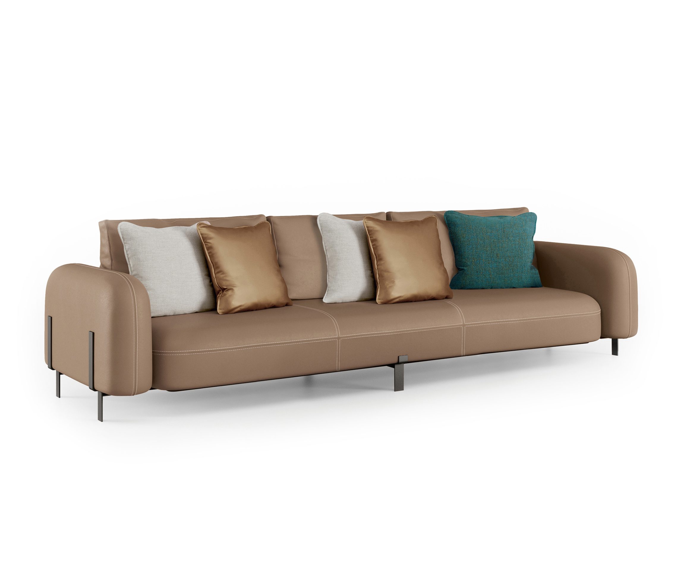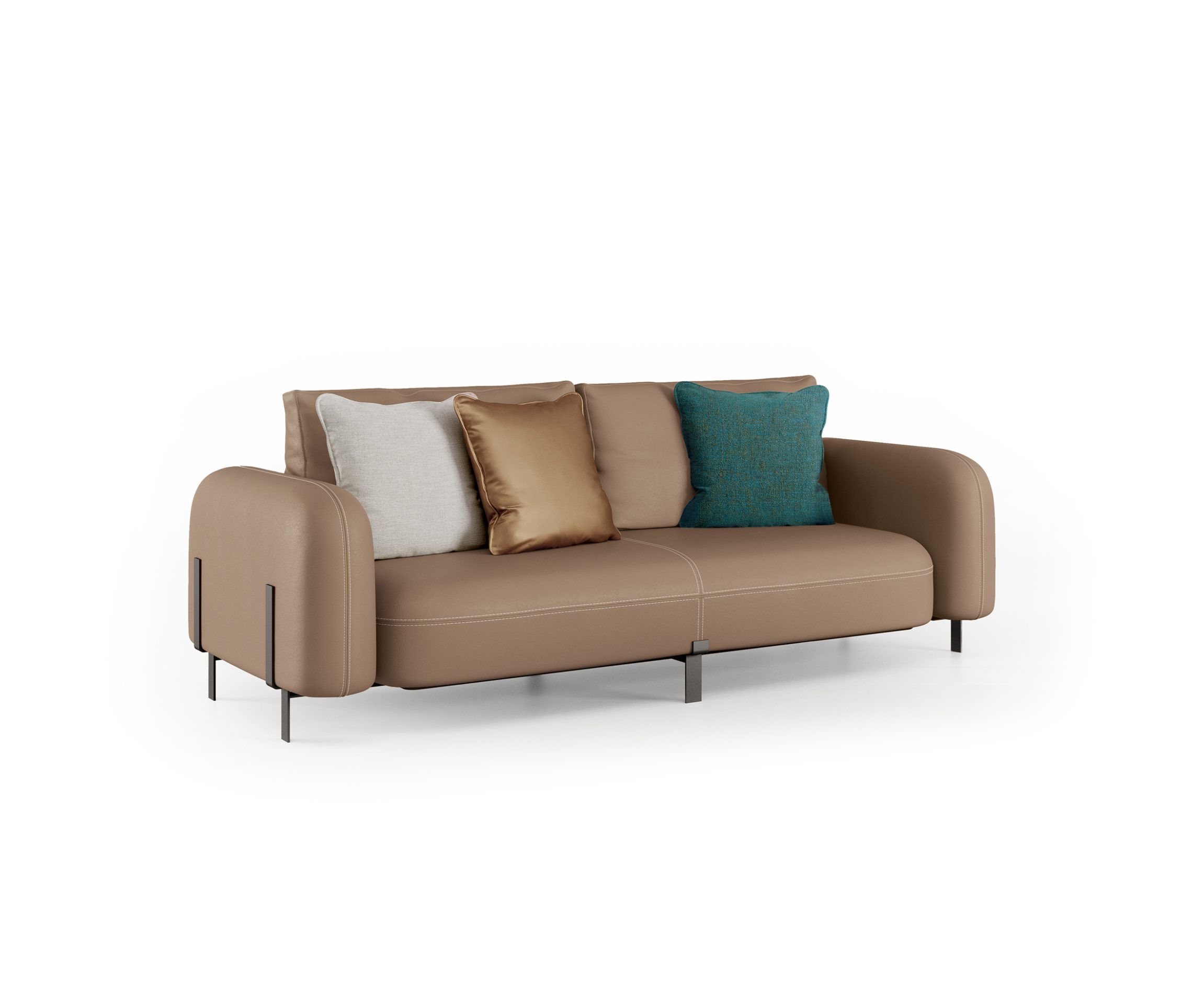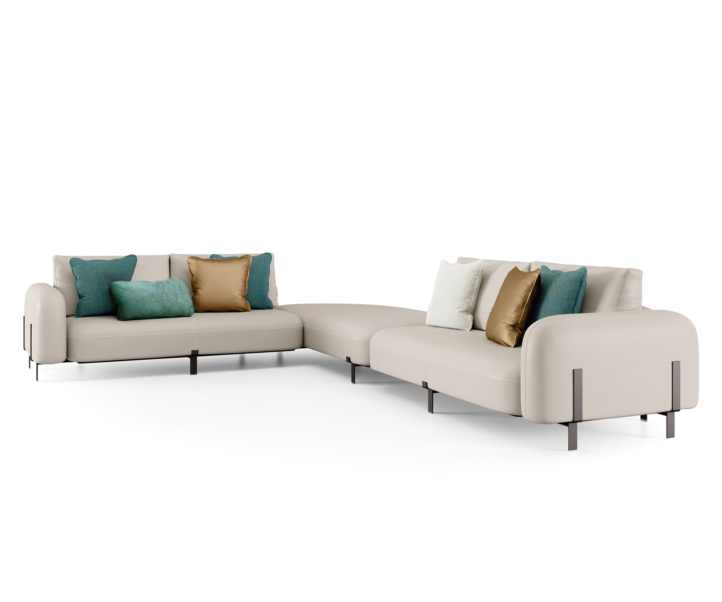 Protagonista della zona living, il divano modulare Amulet by BizzottoItalia, con la sua dinamica forma a goccia, è enfatizzato dalle cuciture a vista e dall’inconfondibile struttura delle gambe in metallo, forgiate come un nastro sottile. La morbida pelle del rivestimento evoca una sensazione di benessere. I divani Amulet sono disponibili sia nella versione standard a due o tre posti, sia nella versione componibile. La modularità degli elementi consente di configurare il divano a propria scelta, con creatività e stile personale, rendendolo ideale per ogni raffinato progetto di interior design.