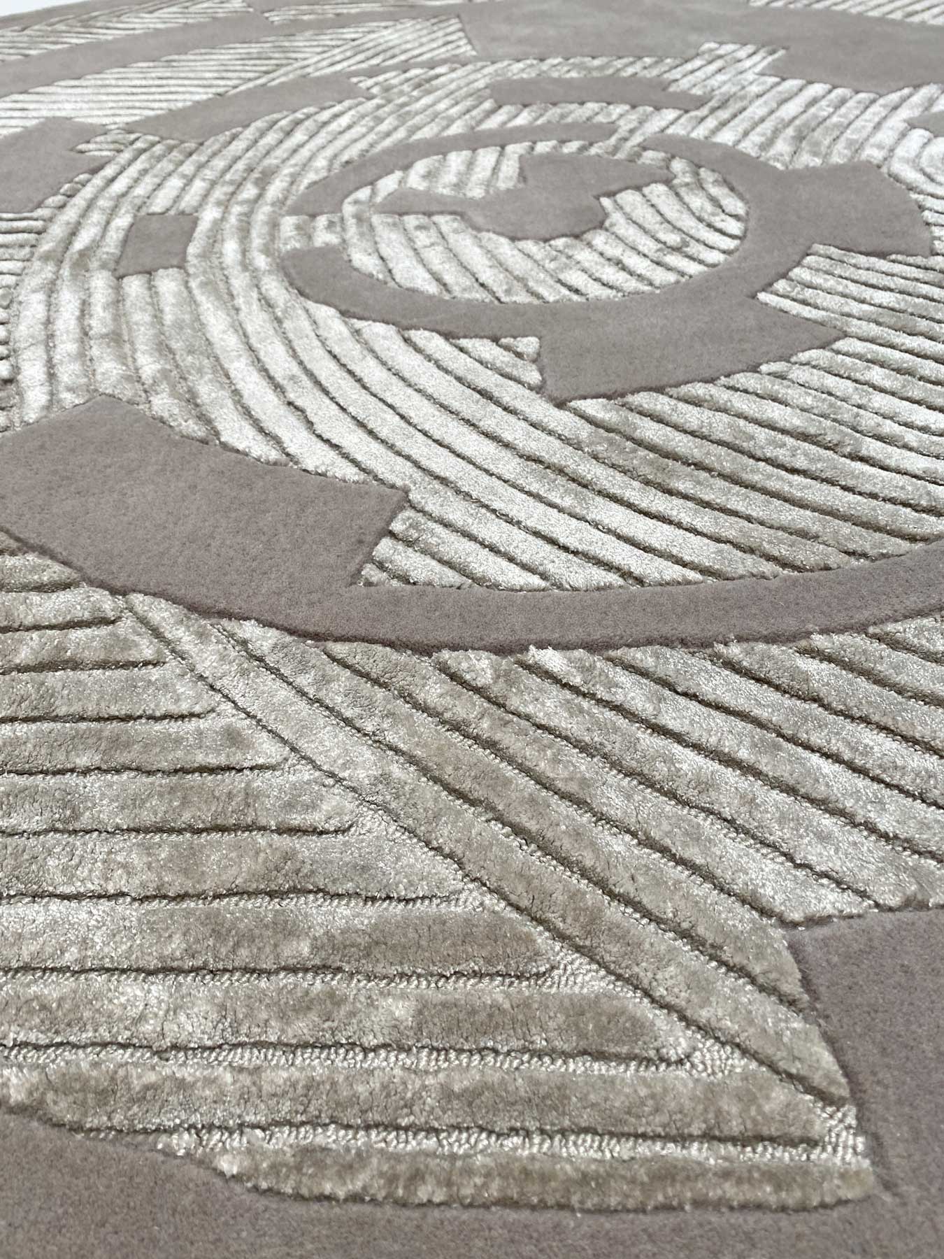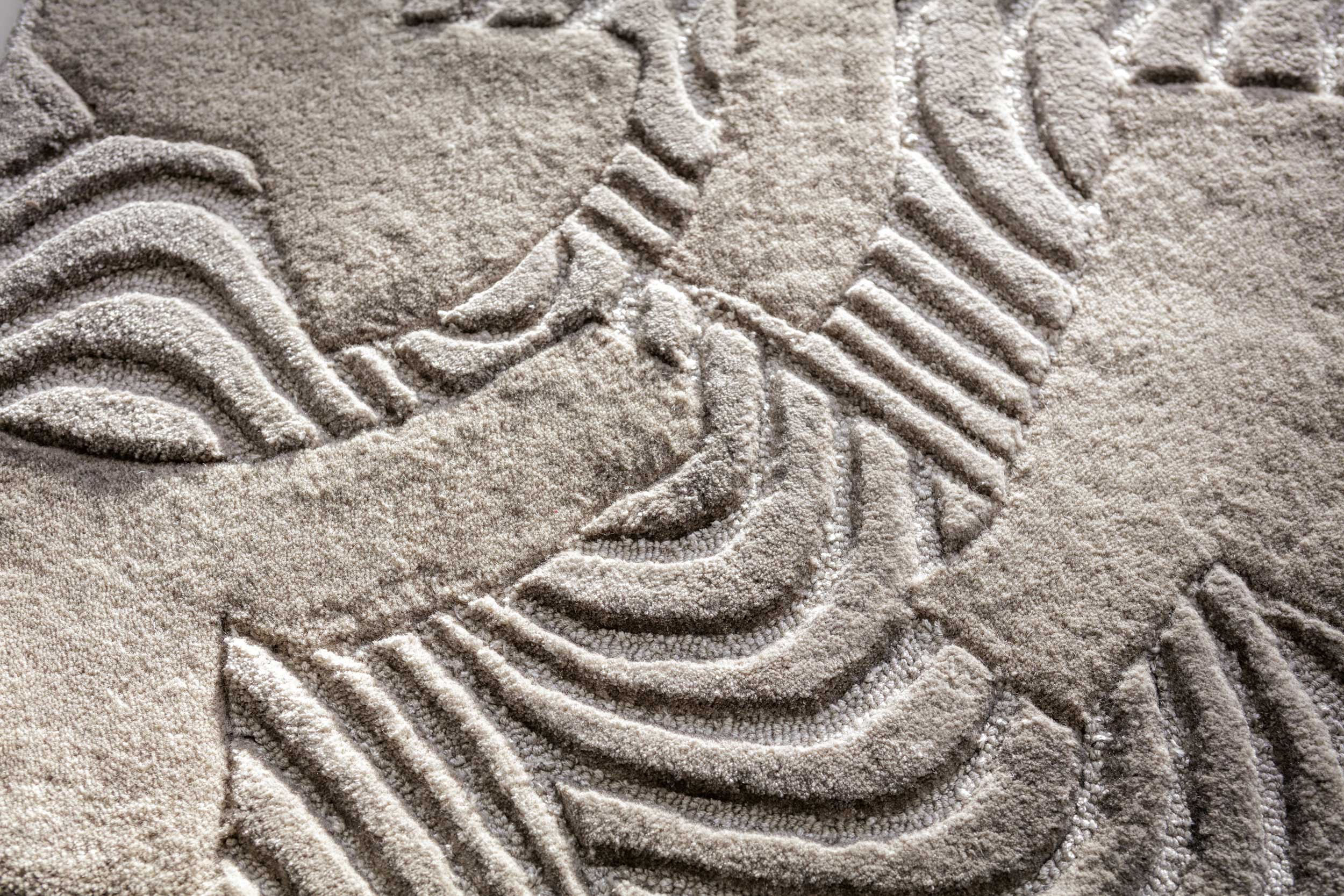 Finemente lavorato, il tappeto Drop by BizzottoItalia alterna diverse tessiture in lana e viscosa per creare geometrie che sembrano impresse nel tessuto con un effetto di alto e basso rilievo.