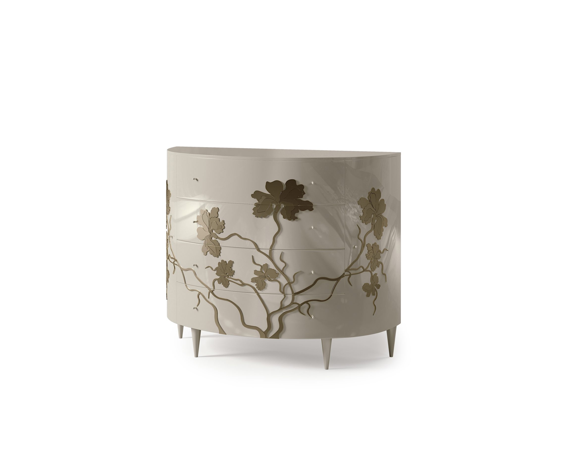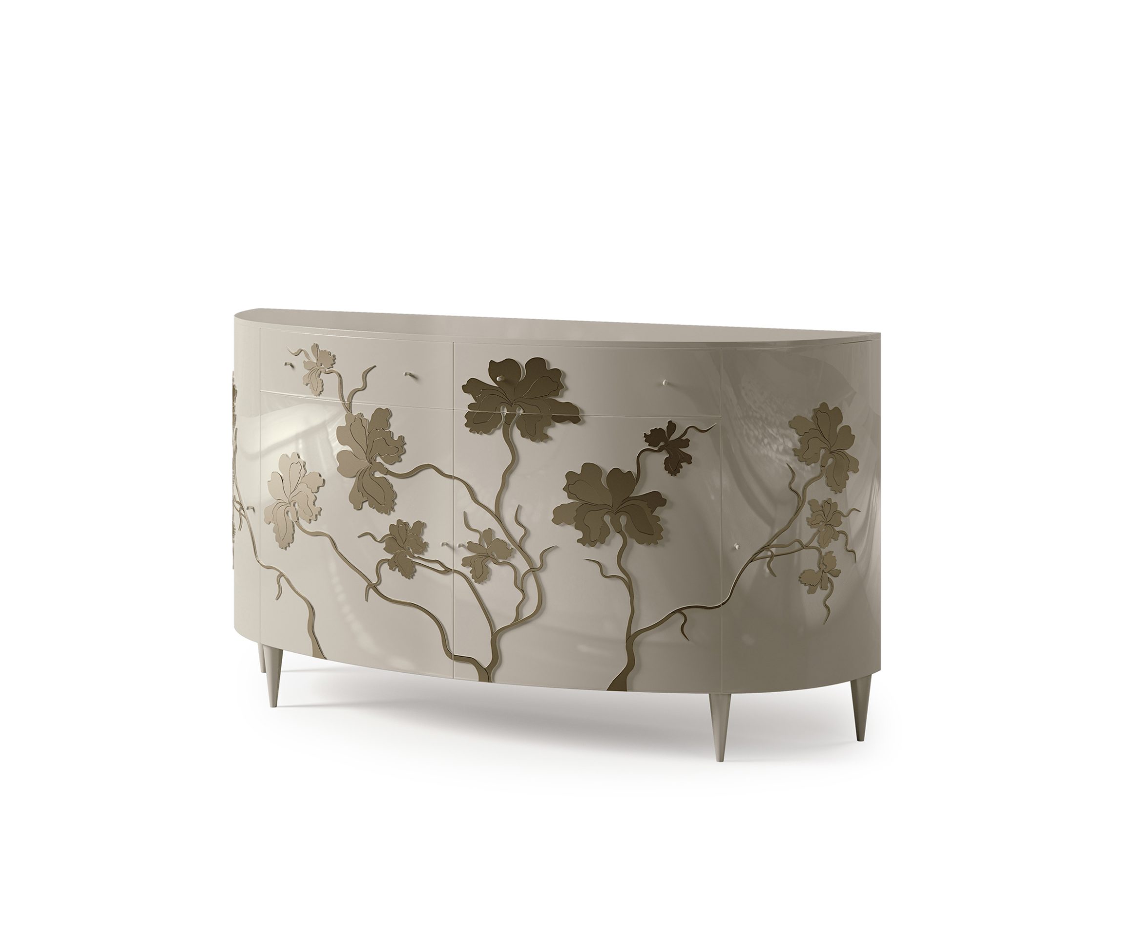 La madia Iris by BizzottoItalia con la sua forma bombata, racchiude in sé un’eleganza senza tempo. Un delicato rilievo di fiori ne esalta le forme. Disponibile sia nella versione monocromatica più moderna e discreta che nella versione con fiori in bronzo antico che si stagliano sulle superfici laccate per dare un tocco più raffinato. La presenza dei cassetti consente di posizionarla in diversi ambienti sia giorno che notte. Una cassettiera che offre diverse possibilità di personalizzazione grazie ad una palette cromatica ricercata.