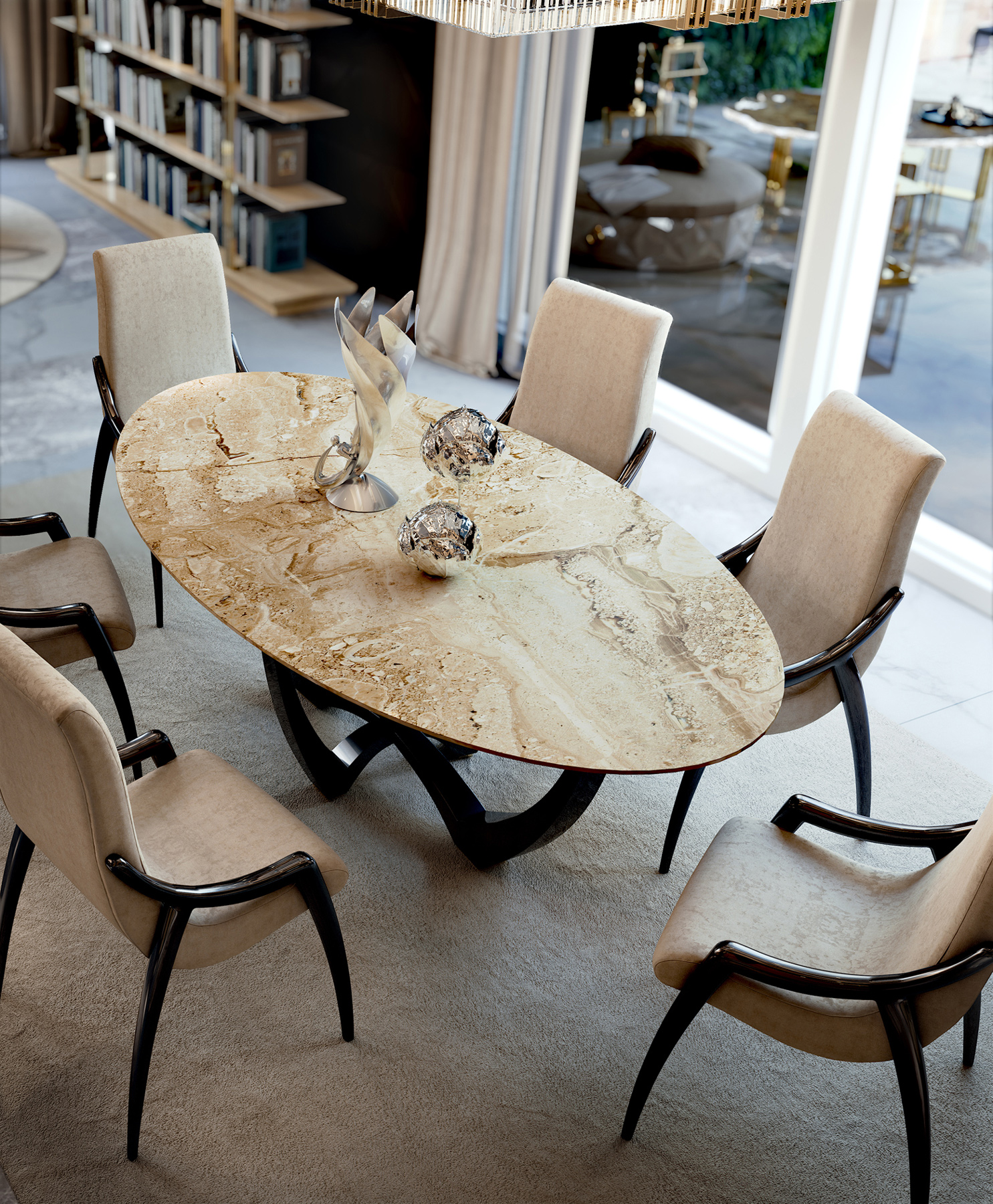 Il tavolo da pranzo Symphony by BizzottoItalia rappresenta l’equilibrio perfetto tra maestosità ed eleganza. Dotato di un basamento ad arco incrociato realizzato in legno laccato, questo tavolo ovale si distingue per la varietà di top e materiali disponibili: marmo pregiato, legno Erable, e le splendide finiture “Ice,” fiore all’occhiello delle lavorazioni BizzottoItalia. Il basamento, monumentale e sobrio allo stesso tempo, aggiunge un tocco di eleganza al design complessivo. Perfetto per impreziosire ogni progetto d’arredo completo, la combinazione di materiali e laccature lo rendono un prodotto molto versatile, ideale per assecondare ogni esigenza estetica.
