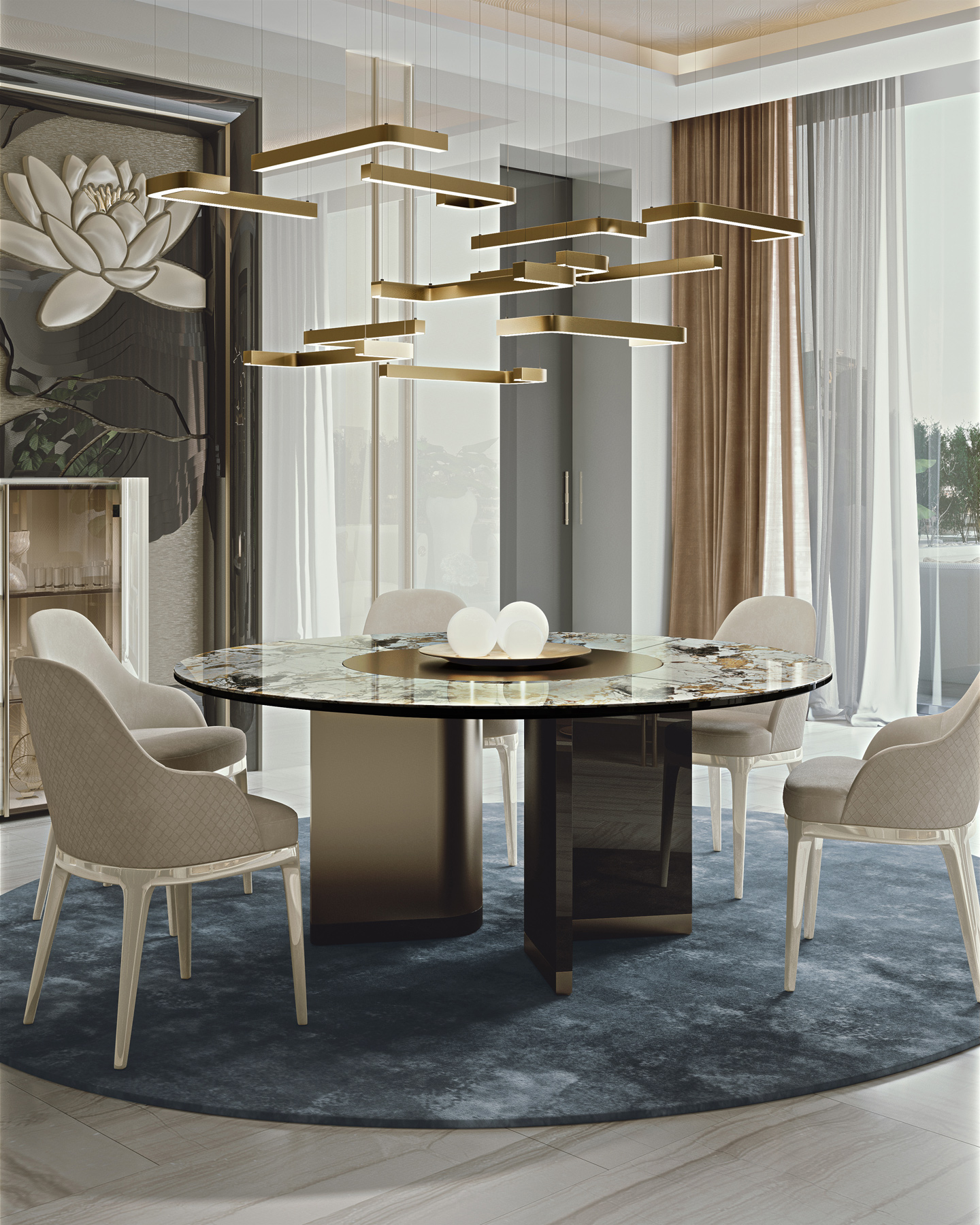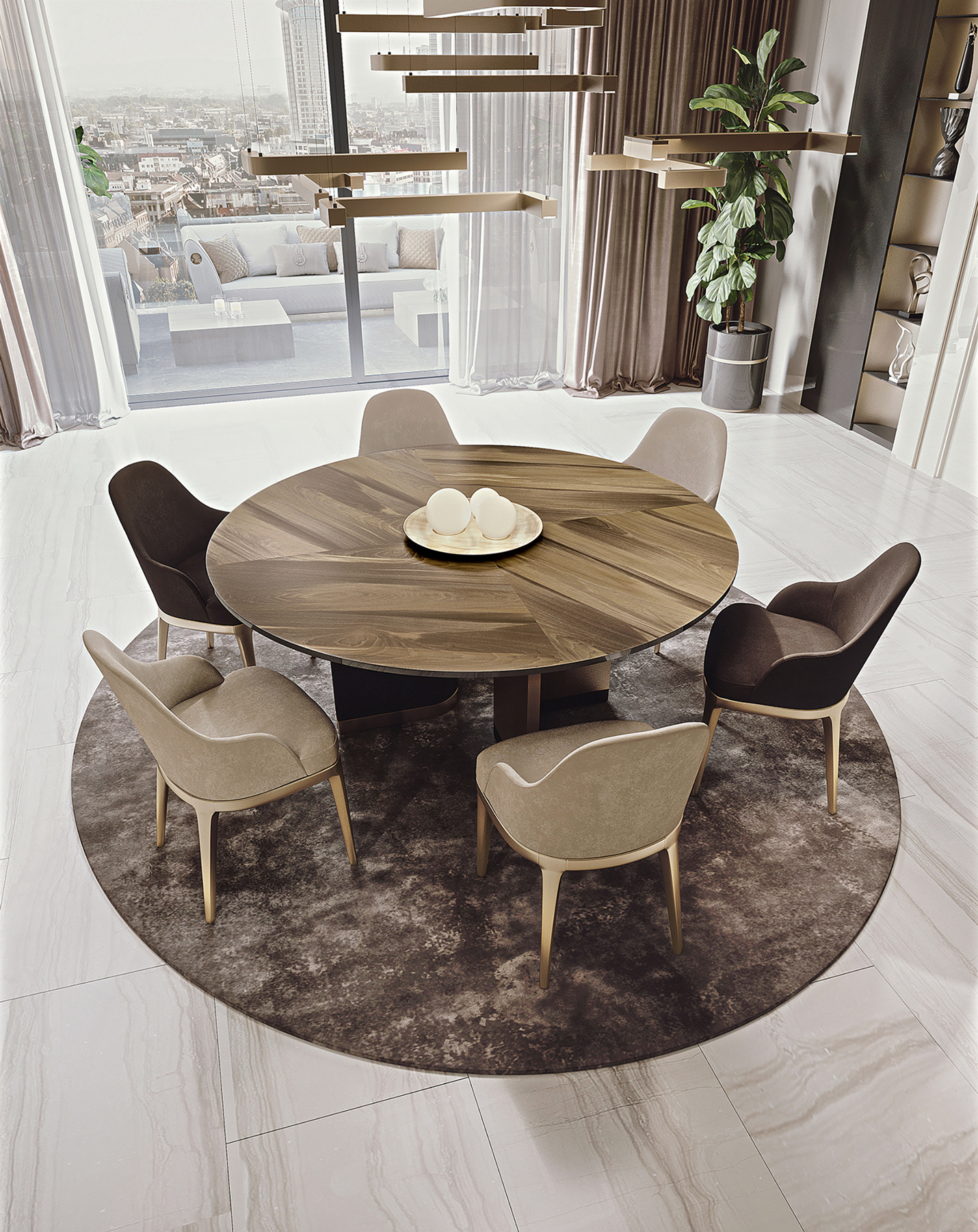 The marble-effect ceramic tops, with various veining patterns, offer a design alternative to suit any stylistic choice. There are two shape variants: the elegant and informal fixed round table and the more majestic rectangular table with rounded corners. A range of solutions ideal for luxury dining rooms and dining spaces.
