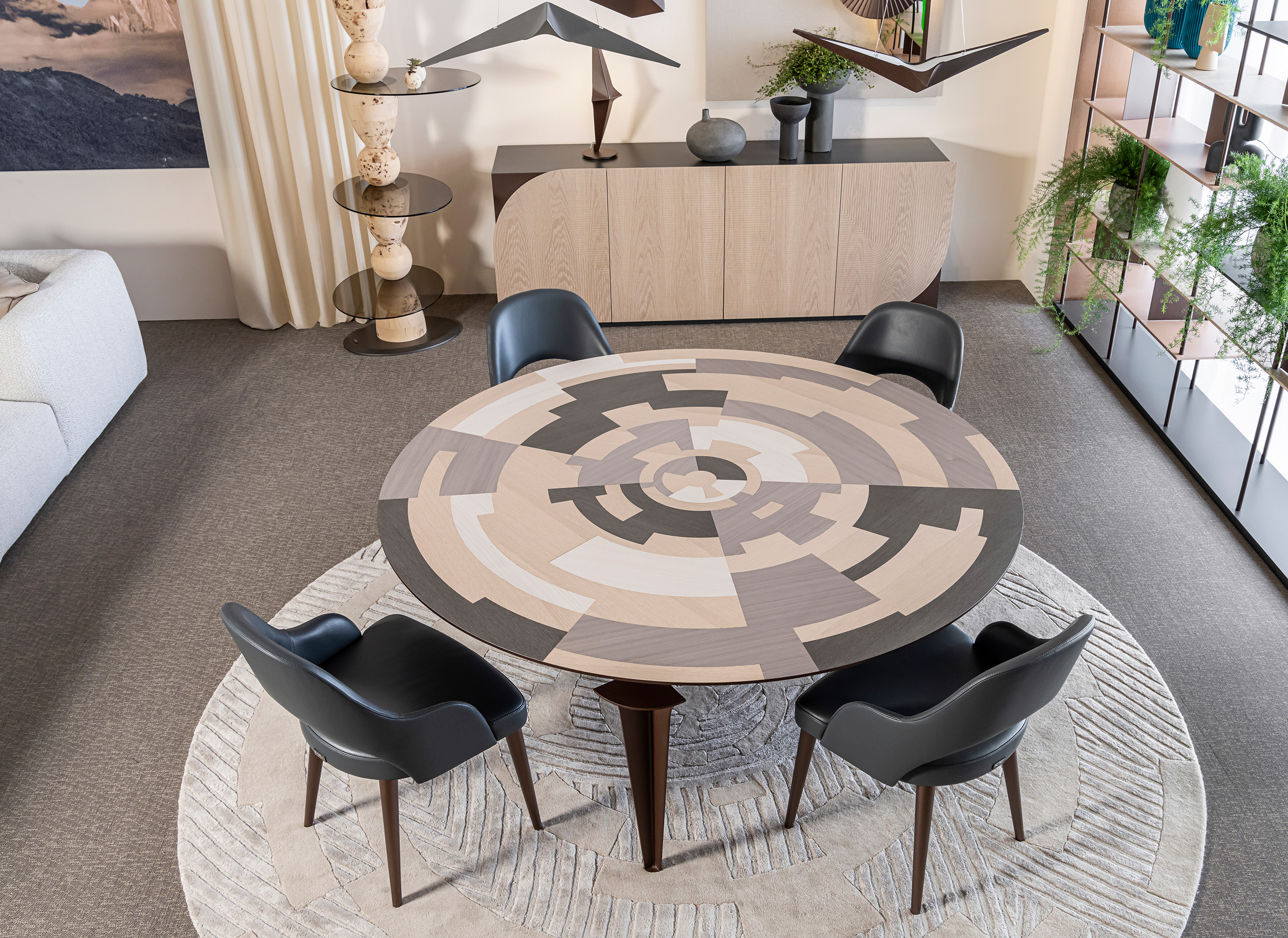 The round Jeté Sound table by BizzottoItalia is an iconic piece thanks to its metal legs that seem to rest on the floor like a ballerina on her toes. The new inlay work of the top allows playing with precious woods such as eucalyptus frisé, natural oak, larch, and eucalyptus, combining them into compositions that enhance the circular geometries. The real protagonist is the wood, a living material whose paired, always different grains make each table a unique and unparalleled piece. In the Jeté Sound table, aesthetics meet sustainability. The raw materials come from certified supply chains, and every small piece from processing waste is reused and expertly inlaid. The resulting geometries highlight the variety of materials and the wood grains, creating a balance of contrasts with great charm.