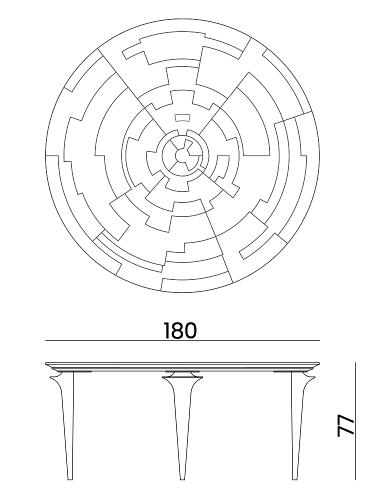 The round Jeté Sound table by BizzottoItalia is an iconic piece thanks to its metal legs that seem to rest on the floor like a ballerina on her toes. The new inlay work of the top allows playing with precious woods such as eucalyptus frisé, natural oak, larch, and eucalyptus, combining them into compositions that enhance the circular geometries. The real protagonist is the wood, a living material whose paired, always different grains make each table a unique and unparalleled piece. In the Jeté Sound table, aesthetics meet sustainability. The raw materials come from certified supply chains, and every small piece from processing waste is reused and expertly inlaid. The resulting geometries highlight the variety of materials and the wood grains, creating a balance of contrasts with great charm.