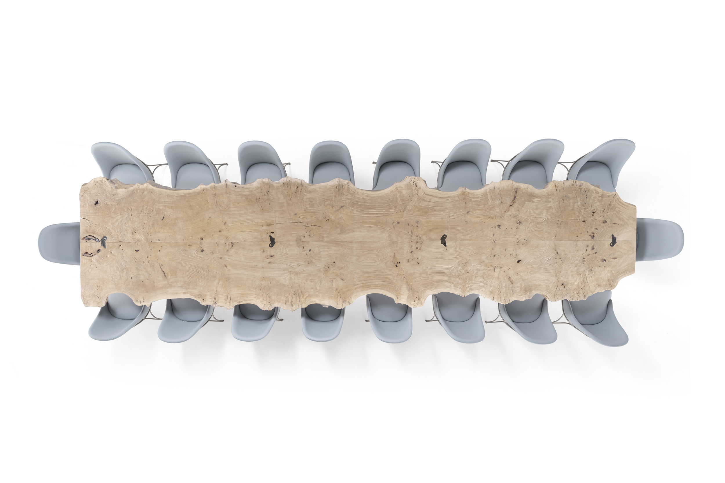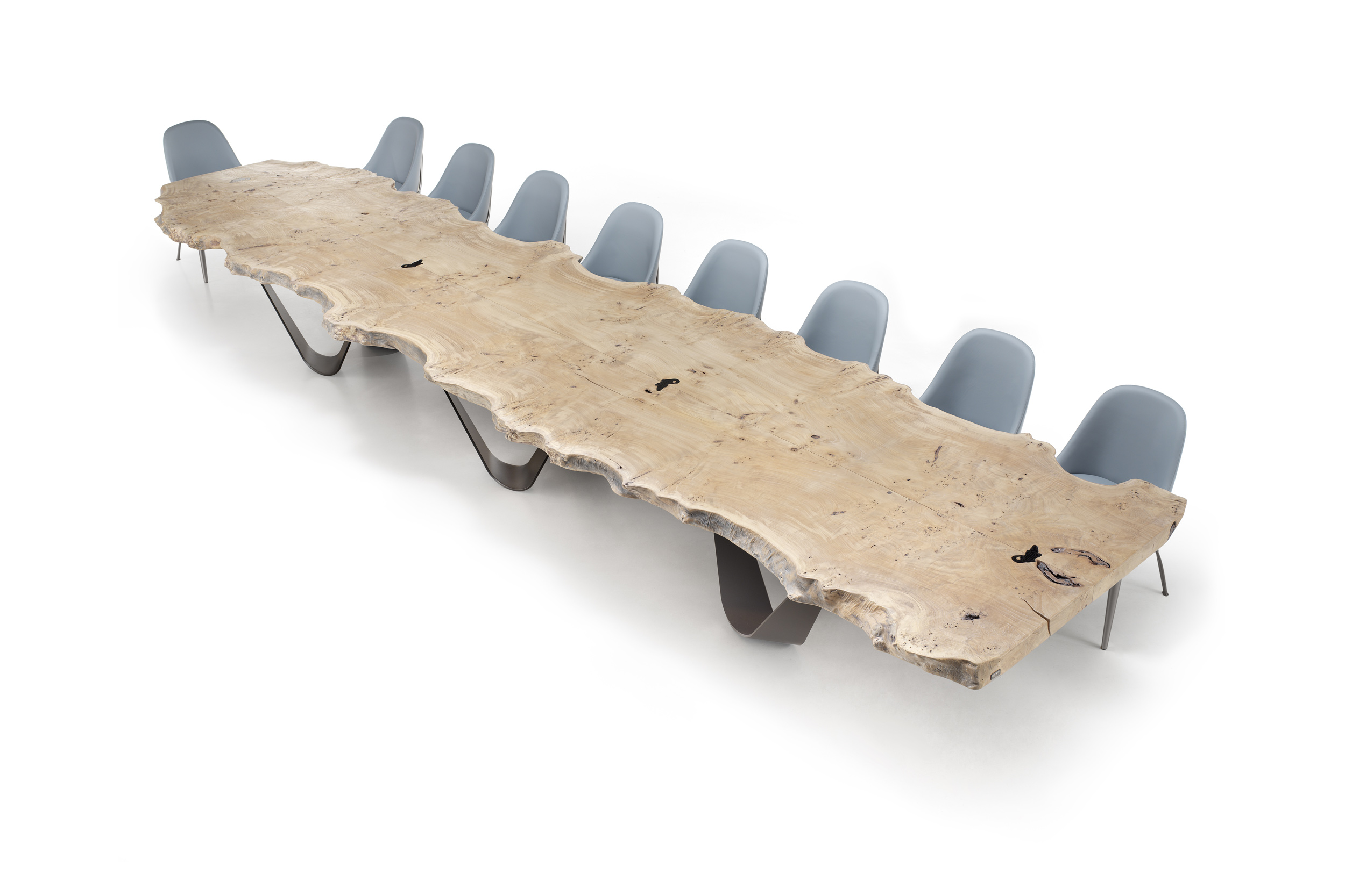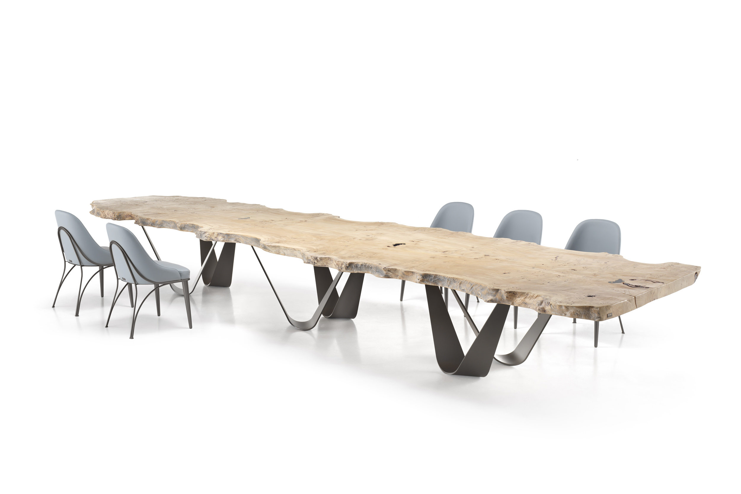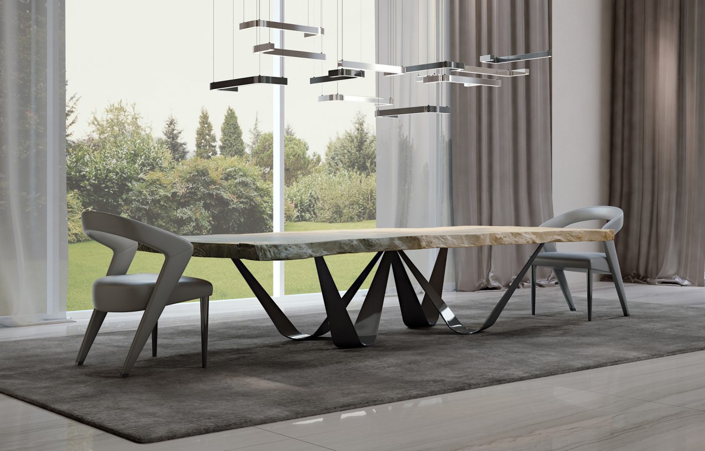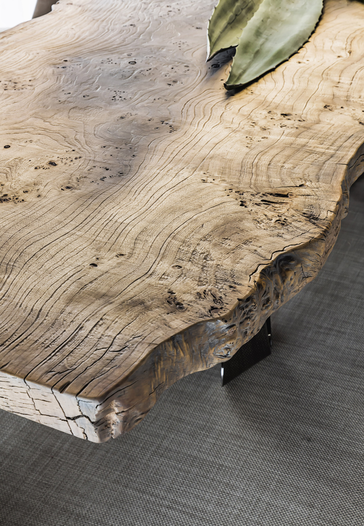 Коллекция, рожденная мощью природы и воплощенная на стыке диаметрально противоположных элементов — земли и воздуха: величественная столешница из корня дерева комбинируется с металлическим основанием chrome black — воздушным элементом, создающим ощущение легкости. Основание можно персонализировать, разворачивая опорную ногу вверх либо по нисходящей линии, напоминающей согнутые ветви деревьев. Корень дерева, проходящий красной нитью через коллекцию Bizzotto Italia, предлагается в актуальной версии с натуральной отделкой светлого цвета, облагороженной оттенком «Shade», очень близким к цвету деним. Универсальность стола усиливается благодаря возможности менять сочетание ножек со стеклянной столешницей, получая абсолютно разные эстетические варианты и эффект восхитительной легкости и воздушности.