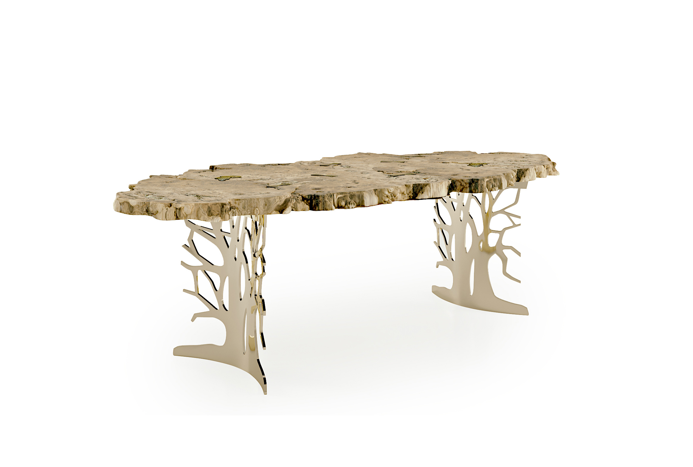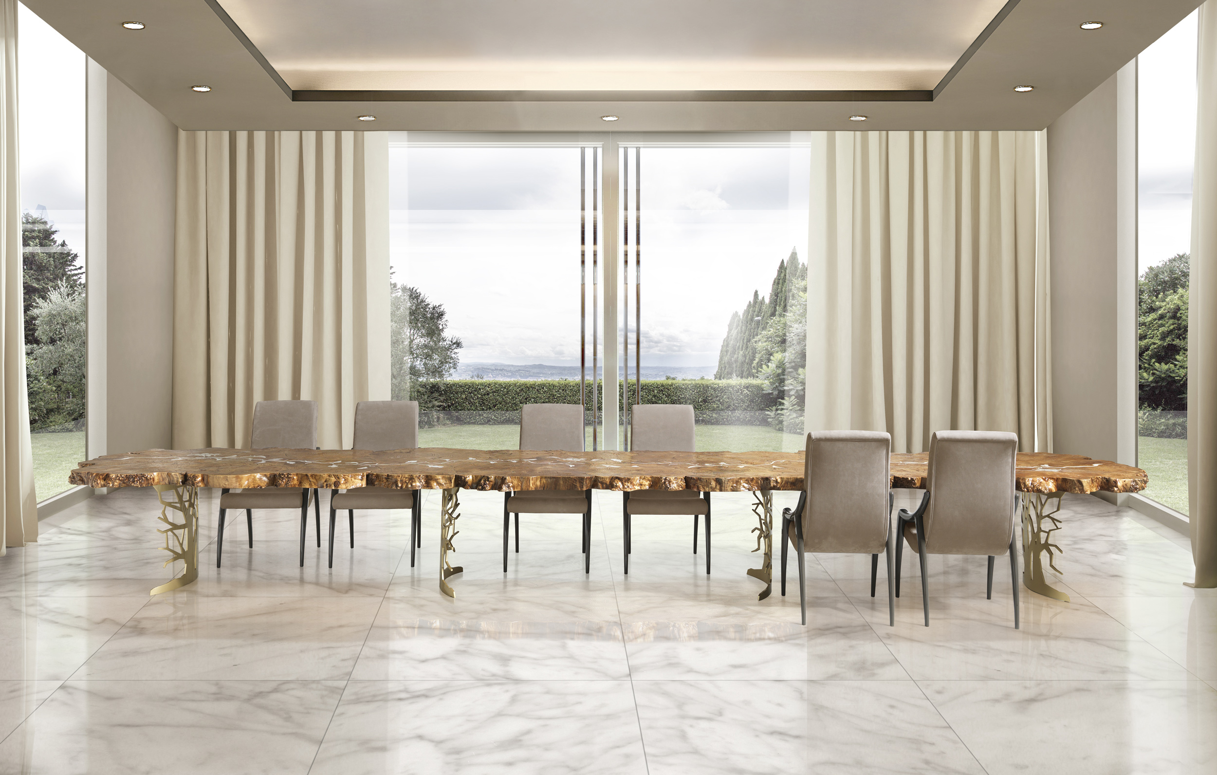 The burl wood from the Sidney collection, the greenest of BizzottoItalia, is transformed into new proposals for the dining area. The importance and love for wood are part of a company philosophy that turns into true art. The beauty of century-old trees, which do not come from deforestation but from felling due to natural phenomena, is exalted to create unique masterpieces. The burl wood used for the top, derived from tree trunks, reveals all the power and spontaneity of nature. The metal base, with its impactful design resembling a stylized tree, enhances the natural forms. The finish, available in steel or 24-carat gold, further emphasizes the shapes of the bases, making this dining table a sculptural and scenic work of art.