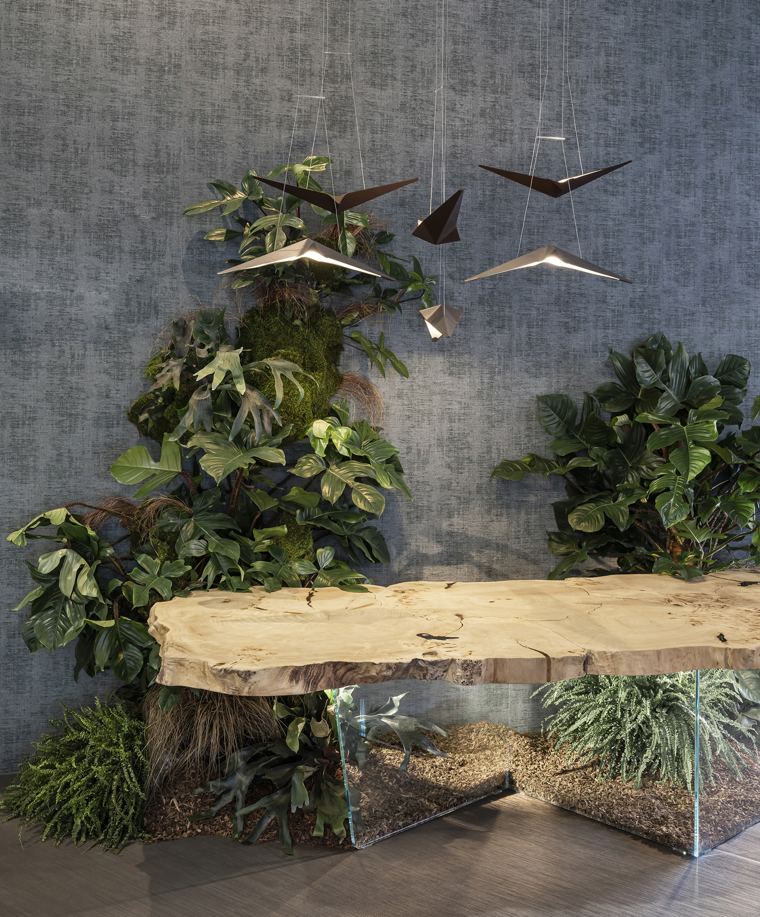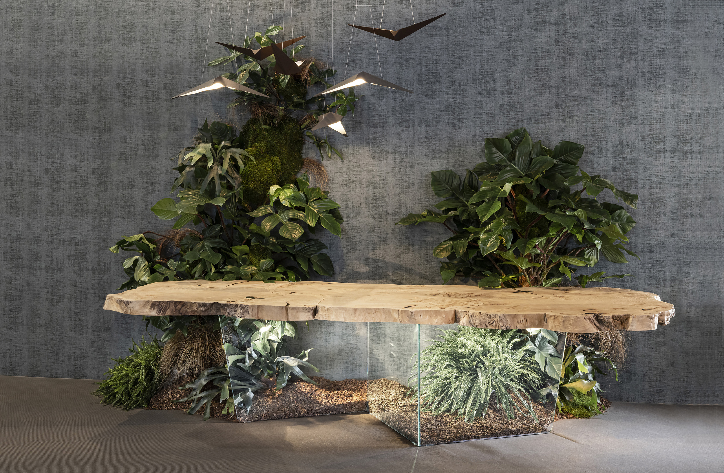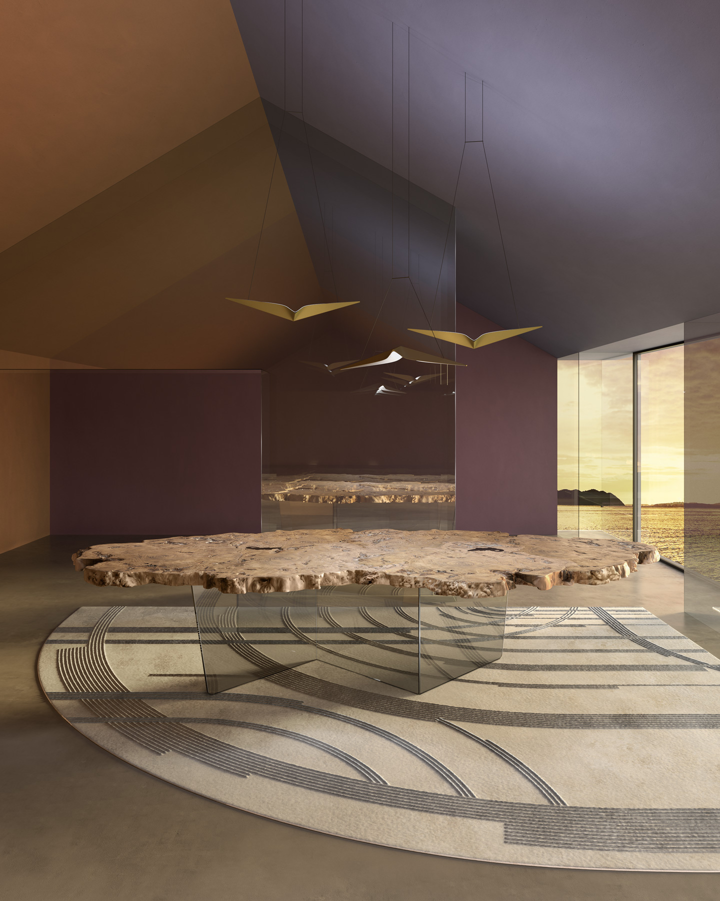 In the Sidney Icon table by BizzottoItalia, nature becomes pure art, and the irregularity of shapes becomes a synonym for uniqueness. The circular grain patterns on the wood sections tell the story of time passing and the natural aging process of massive centennial trees that are recovered rather than cut down. The original wild beauty of the natural burl wood top is enhanced by the use of non-toxic, water-based lacquers suitable for everyday use. The distinctive zig-zag shape of the glass legs, itself a sustainable and recyclable material , contributes both conceptually and stylistically to defining the strength and exclusivity of this modern design table. With Sidney Icon, BizzottoItalia turns nature into a symbol of conscious elegance and timeless beauty.