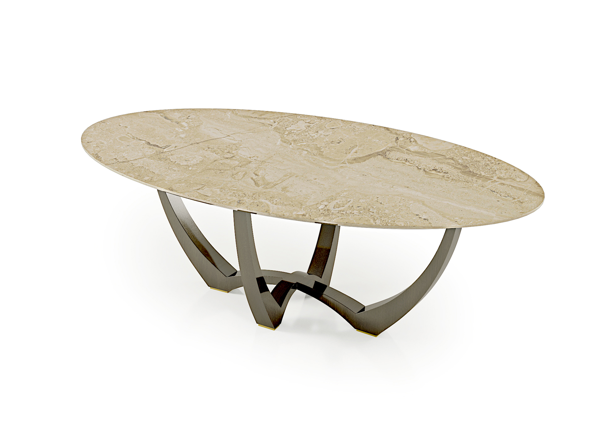 The Symphony dining table by BizzottoItalia represents the perfect balance between grandeur and elegance. Featuring a crossed arch base made of lacquered wood, this oval table stands out for the variety of tops and materials available: precious marble, Erable wood, and the splendid “Ice” finishes, the pride of BizzottoItalia’s craftsmanship. The base, monumental and sober at the same time, adds a touch of elegance to the overall design. Perfect for enhancing any complete interior design project, the combination of materials and lacquers makes it a highly versatile product, ideal for meeting every aesthetic need.